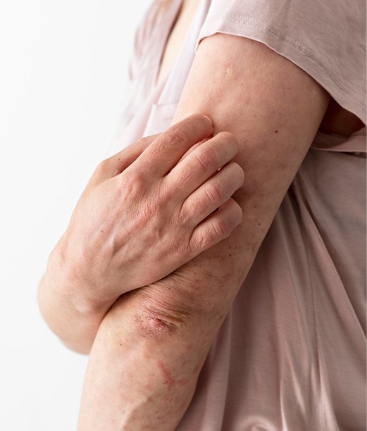 In Ayurveda, Psoriasis is referred to as Kithibha, an autoimmune condition that leads to the formation of thick, red, dry patches of skin that can be itchy or painful. It can affect any area of the body. Psoriasis is believed to arise from an imbalance in the Vata and Kapha doshas, which disrupt the body’s natural balance and trigger the skin’s inflammatory response.